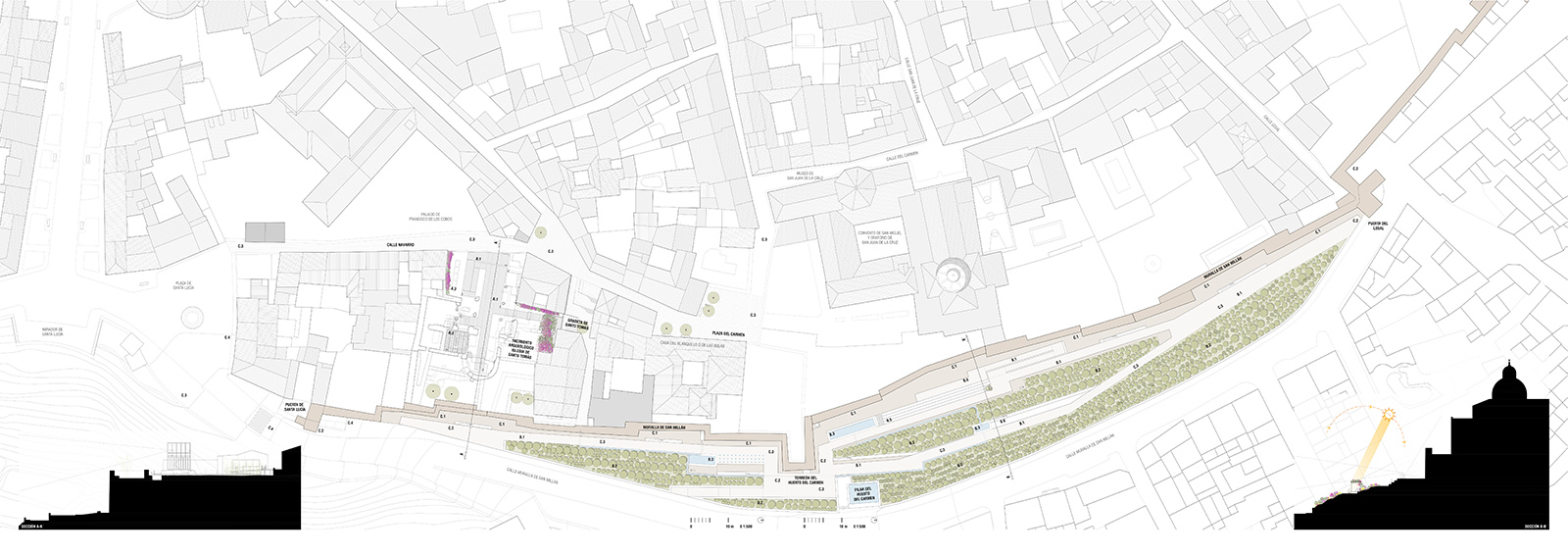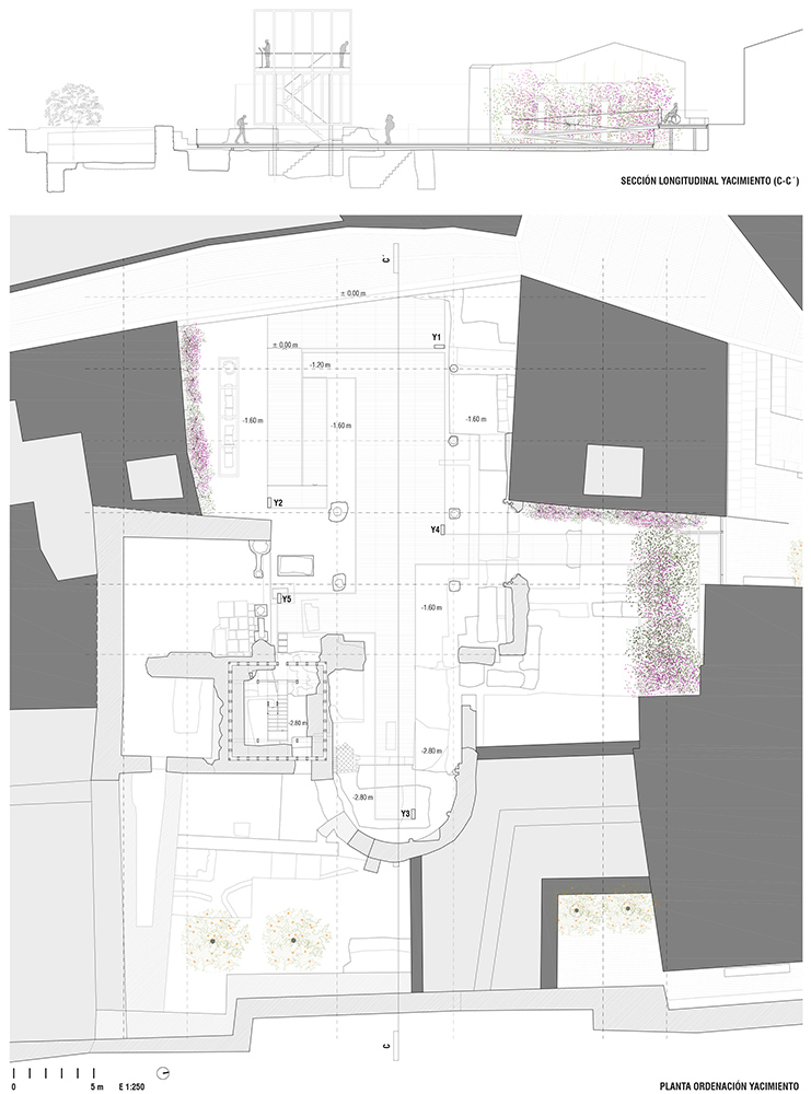 Las bases del concurso pedían la puesta en valor del Yacimiento de Santo Tomás y su entorno paisajístico, incluyendo una reconstrucción volumétrica, la cual por encontrarse muy poco documentada decidimos elevar el cuerpo correspondiente al torreón de dicha iglesia para poder observar tanto el yacimiento como el propio barrio de Santo Tomás y el impresionante paisaje de olivos.